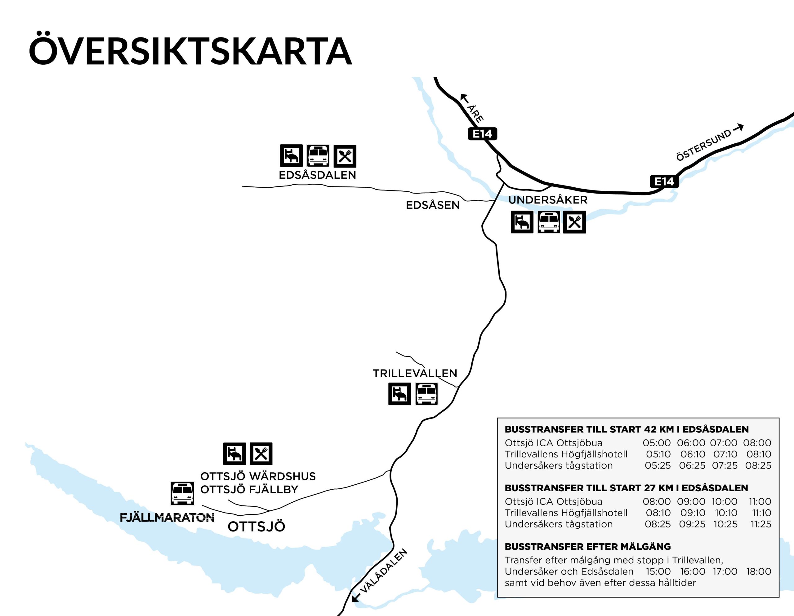 Take the train to Undersåker station and then we would recommend a taxi in order to reach Trillevallen, Edsåsdalen, Ottsjö or Vålådalen. Phone Taxi Västjämtland +46 647 104 00. For those arriving by night train on the day of the race, there will be a transfer to the start. Transfer will be available for booking two weeks before the race.